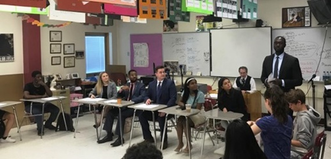On May 31st, Updike, Kelly & Spellacy, P.C. attorneys, summer associates, and interns visited Wilbur Cross High School as part of the firm’s pledge to the Connecticut Bar Association diversity and inclusion committee and pipeline initiative. The project ultimately aims to enhance diversity within the legal community in the State of Connecticut. Specifically, the pipeline initiative targets the lack of diversity in legal education, and serves to inform high school students of their options in pursuing a legal education or career. The visit to Wilbur Cross, headed by attorneys Evan Goldstein and Gideon Asemnor, allowed summer associates and interns to participate in a mock voir dire assignment, as well as the opportunity to share their reasons for entering the legal field, and what steps students may take in order to further similar aspirations.